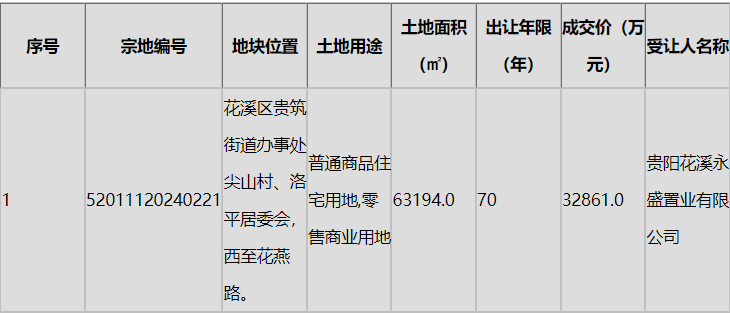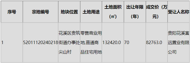 在住宅用地方面,花溪区贵筑街道办事处尖山村地块(编号52011120240218)以8.28亿元的成交价成为本次出让的"标王",该地块面积达132420平方米,由贵阳花溪宾远置业有限公司竞得。