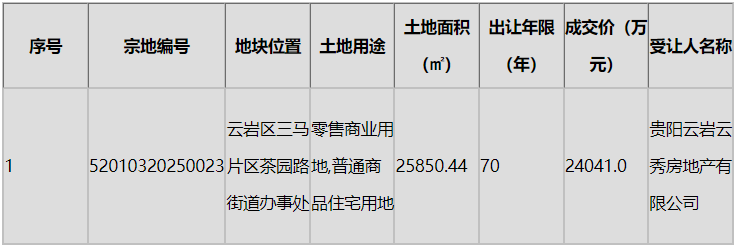 云岩区两宗住宅用地分别被贵阳云岩筑黔房地产有限公司和贵阳六岩天秀房地产有限公司竞得,成交价分别为3.69亿元和2.40亿元,显示出核心区域住宅用地持续受到市场青睐。